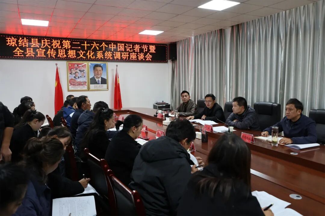 在第二十六个记者节即将来临之际,11月7日上午,琼结县委书记尤刚前往县宣传思想文化系统各单位进行实地调研,并召开工作座谈会。琼结县委副书记袁斌,县委常委、宣传部部长边巴,县政府副县长米玛次仁一同参加。
